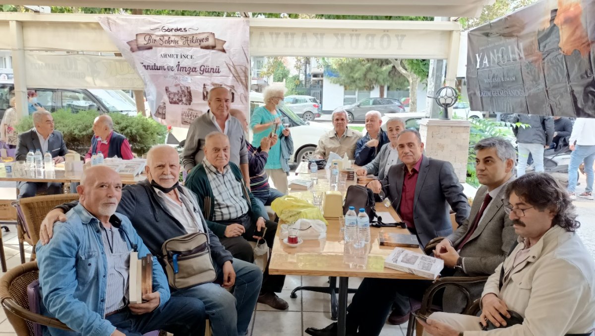Ahmet İnce “Gördes, Bir Şehrin Hikâyesi” kitabını, Kazım Germiyanoğlu da “Yangın” romanını hemşerilerimize imzaladı. İmza günü vesilesiyle, yıllardır birbirini görmeyen hemşerilerimiz hasretle kucaklaştı. Bir yandan kitaplar imzalanırken, sohbetler geçmişten ve Gördes üzerine yapıldı.