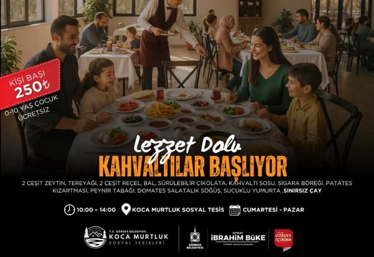 “Gördes’in eşsiz doğasında, Koca Murtluk Sosyal Tesislerimizde sevdiklerinizle birlikte keyifli bir kahvaltıya davetlisiniz! Zengin kahvaltı menümüz, sıcacık çayımız ve huzurlu atmosferimizle hafta sonlarınıza lezzet katıyoruz.” ifadeleri kullanıldı.