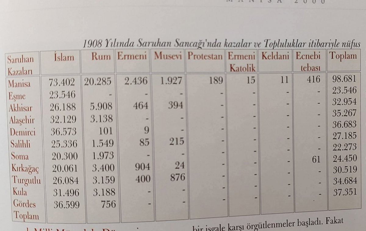 Temin ettiğim tarihi bir belge, 117 yıl önce Manisa ili ve ilçelerinin nüfus sayısını gösteriyor. Belgede nüfus sayısı, azınlık guruplarının sayıları da verilerek hesaplanmış. Bu belgenin ismi şöyle; 1908 İTİBARIYLA SARUHANLI SANCAĞININ TOPLULUKLAR İTİBARIYLA NÜFUSU.
