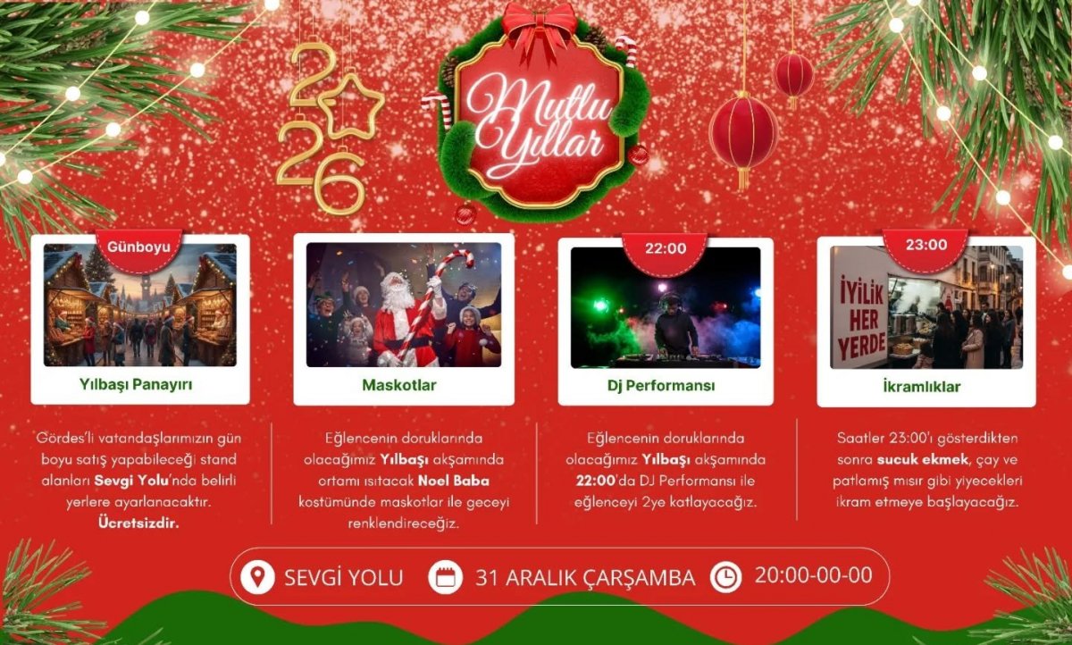Belediyeden yapılan açıklamada; “2026’ya hep birlikte, neşe ve dayanışma dolu bir atmosferde “Merhaba!” demeye hazırlanıyoruz. 31 Aralık Çarşamba akşamı Sevgi Yolu’nda düzenleyeceğimiz yeni yıl etkinliklerimize tüm hemşehrilerimizi davet ediyoruz. Yeni yıl ruhunu paylaşmak, birlik ve beraberliğimizi güçlendirmek için hepinizi Sevgi Yolu’nda buluşmaya bekliyoruz.” ifadeleri kullanıldı.